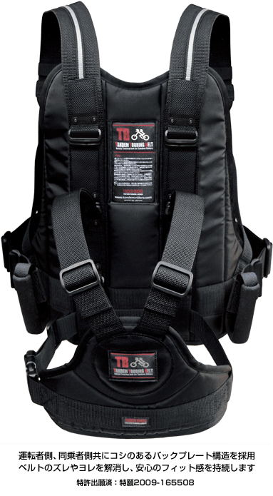 タンデムツーリングベルトTBは、運転者と同乗者それぞれの背面部に4層構造を持ったコシのあるバックプレートを採用することによって、走行中のベルトのズレやヨレを解消!