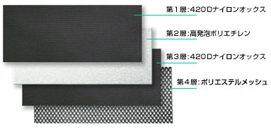 第1層:420デニールナイロンオックス(裏面弱撥水コート)