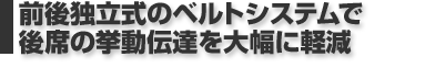 後席の挙動は運転者のバックプレートの中心部に伝わり、テコの原理が働くことを極力抑え込み、挙動伝達を最小限に留める効果を持ちます。