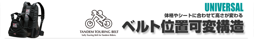 タンデムツーリングベルトTBは、ベルト位置可変構造により様々な体格やオートバイのシート段差形状に対応する、新発想のタンデムベルトです。
