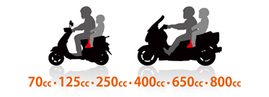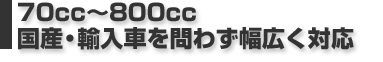 70ccの原付二種から最大排気量スクーターの800ccクラスまで、一般的な形状のスクーターであれば、あらゆる車種にほぼ対応しています。