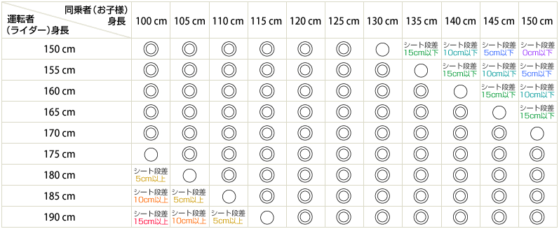 但し「乗員の身長差」から「オートバイのシート段差」を引いた高さが、0cm〜75cmの範囲である事が条件となります。